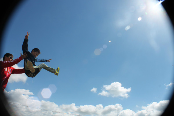 兒子和他爸爸在一片空地上玩起了摔跤,而我躺在草地上,隨意的拍著他們。