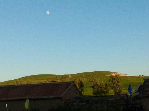 這里的日照時間長,早上四點左右天就亮了,這是我拍的傍晚的景色,月亮雖然早早的就出來了,但是等到天全黑了也得九點左右。