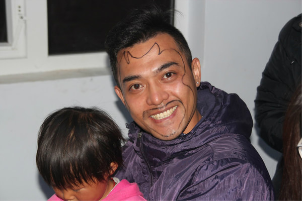 下午一覺醒來,正好其他人從外面拍片臭美回來(佩服他們的精力充沛哈~),于是眾人圍坐一室,準備出眉筆,開始保留項目之1,打牌:6人兩副牌抓雙黑桃A,贏家在輸家臉上“一筆畫畫”,并且約定吃飯的時候誰也不許洗掉,哈哈,太有意思了,不過最后吃飯的時候小樓居然沒輸一把,簡直不可思議嘛,無語….到餐廳的時候,我們這一桌就是再次成為焦點,目光頻頻匯聚,甚至吸引來了老板的小女兒和我們一起邊吃邊玩,哈哈,小家伙老有意思了….然后呢,就是例行的吃烤羊,圍篝火,看人家放孔明燈,自己唱歌(不得不佩服老板,自己買了套專業點歌設備和音響,有魄力啊!),繼續玩保留游戲項目之2:國王游戲….
