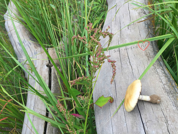 湖邊的枯木和蘑菇。