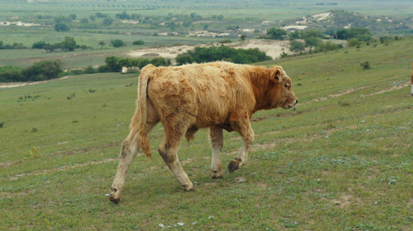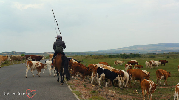 路上碰到牛群穿越馬路。草原上這種情況非常常見。