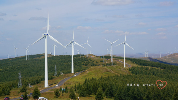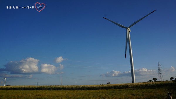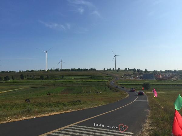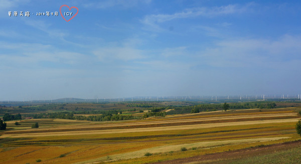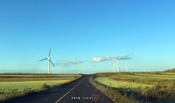道路蜿蜒向前,起伏不斷,如同一條黑色帶子飄蕩在無邊的草原之上。金秋時節,兩邊的莊稼地進入收獲期,深淺不一的黃綠色塊交錯,與藍天白云和大風車映襯在一起,在夕陽的照耀下,跟油畫一般。