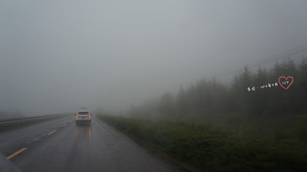12點多車行至壩上,這邊也起霧了,能見度不足10米。車輛都打開了霧燈和雙閃,緩慢前行。穿行在云霧之間,直到下了壩子,霧氣才漸漸散去。