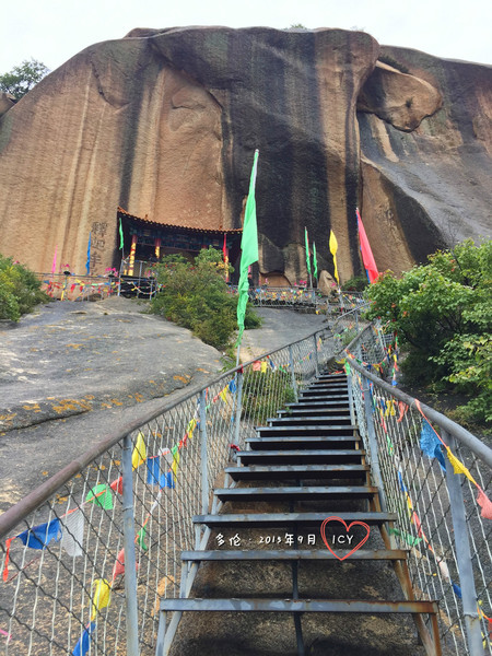 此時已近1點,道路前方突然出現一座巨大的石頭山,峭壁之端建有廟宇,遠遠望去頗為震撼。
