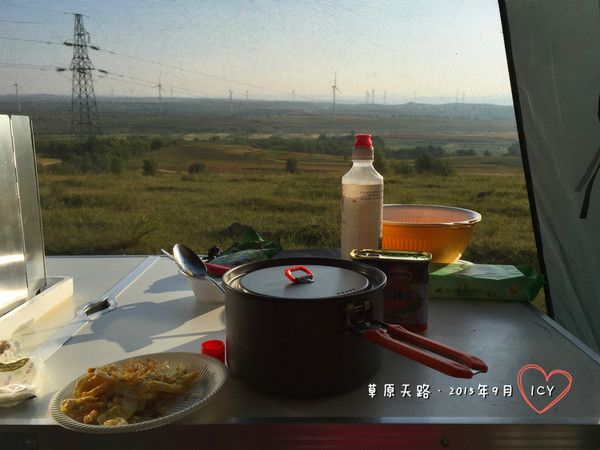 燒了水,沖了咖啡。熱了兩罐八寶粥。炒了兩只雞蛋。煎了一個饅頭片和幾塊午餐肉。這一切都是沐浴在晨光之中完成,看著眼前廣闊的草原美景,心情不是一般的好啊!