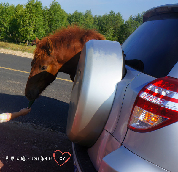 我從車后扒出一根黃瓜,馬兒終于肯賞臉,慢慢踱了過來。不過貌似它牙口不大好,咬了半天才咬住。