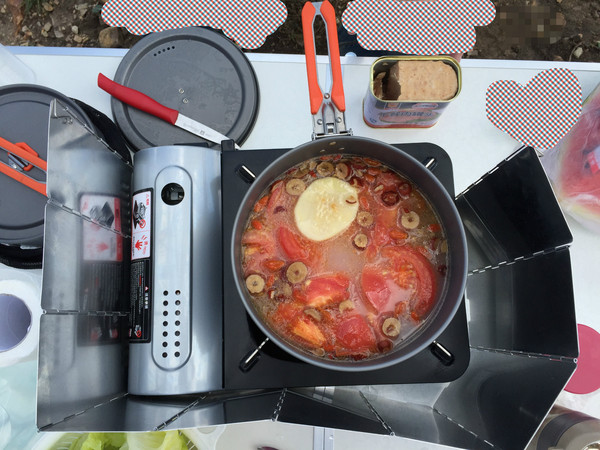 加水,倒入鍋底,西紅柿切塊,土豆切片,統統扔進去。開鍋之后,再把午餐肉、金針菇、生菜也陸續加入其中。最后來一包方便面收尾。不得不說:味道非常贊!