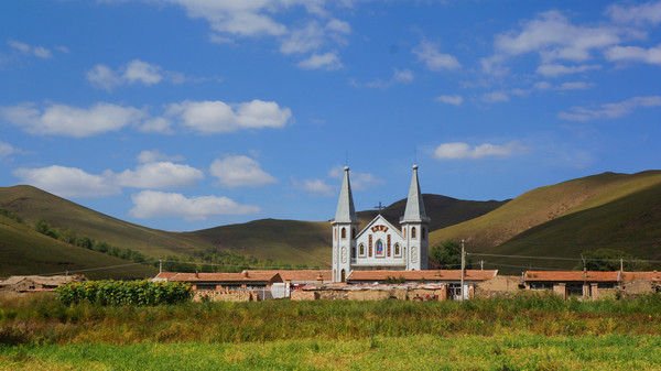途徑一個小村,藍天白云綠草映襯下的天主教堂,有點異國風情。