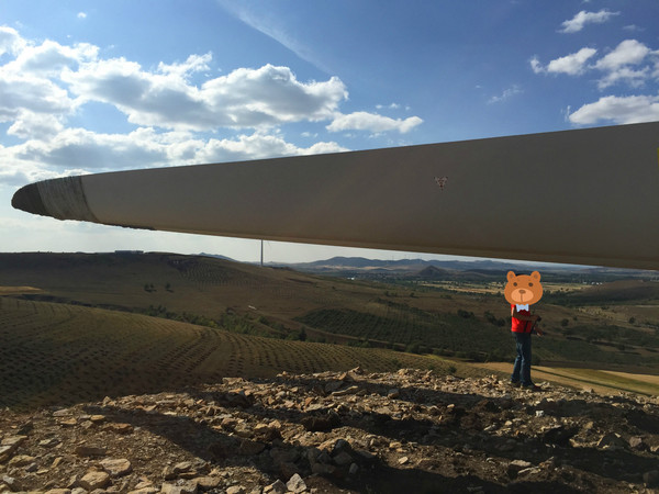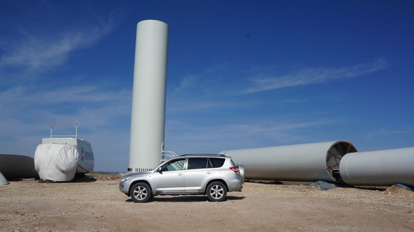 還經過一處正在修建的風電場。大風車還沒組裝起來。我們跑到跟前看了看,每個扇葉都那么巨大。和風車相比,車子顯得很小。