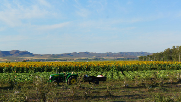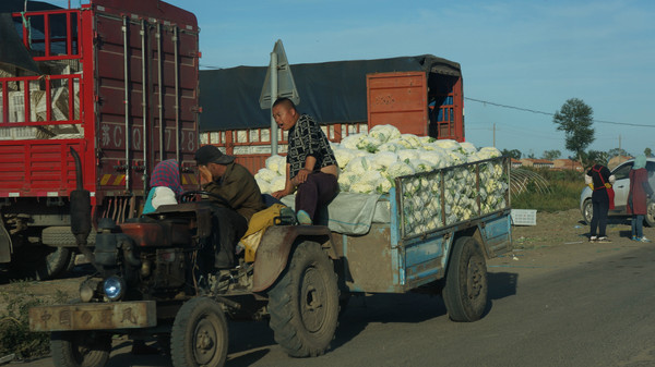 經過沽源時,兩邊菜地里各種蔬菜正在豐收。沽源是蔬菜大縣,北京市場上不少蔬菜來自這里,我們看到了滿載的花菜、白菜、卷心菜等等。