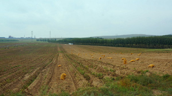 多倫也種了很多土豆,此時正值收貨季節,大型機械收割之后,人工裝袋、運走。